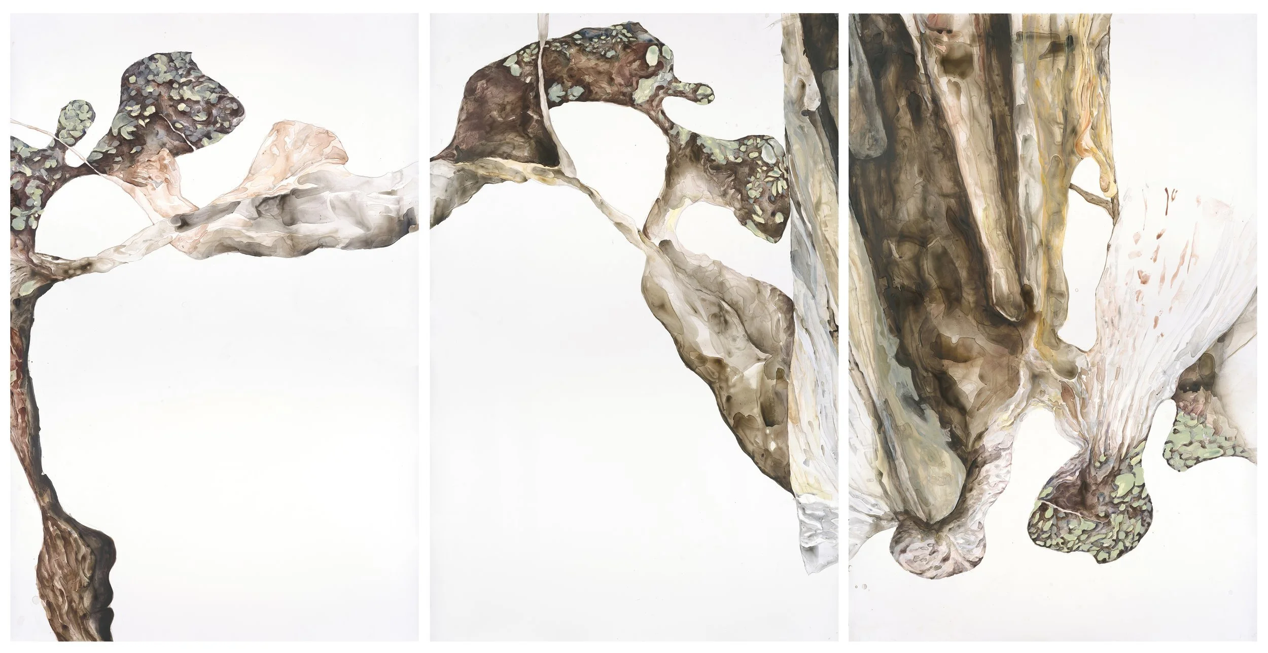 Rainey Straus is a painter and photographer. She writes: “My practice responds to the unfolding absences caused by the climate crisis. Co-creating with the more-than-human world, I make cyanotypes and paintings rooted in walking the land. The cyanotypes, made over multiple days of hiking, tell the stories of time, form, and events that have shaped specific sites. The large paintings explore old-growth forests filtered through the lens of technology (3D or LiDar scans.) The final compositions are distorted fragments that mirror the objectification of the natural world and our disconnect. I am interested in questions related to non-human subjecthood, attention as care, and building relationships with specific places. My work simultaneously expresses the aliveness of the world while navigating collapse and destruction. For me, beauty, awe, and wonder inspire action. My intention is to invite inquiry: What stories does the land tell? How do we grow reciprocity? And how might we live on a changing planet?”